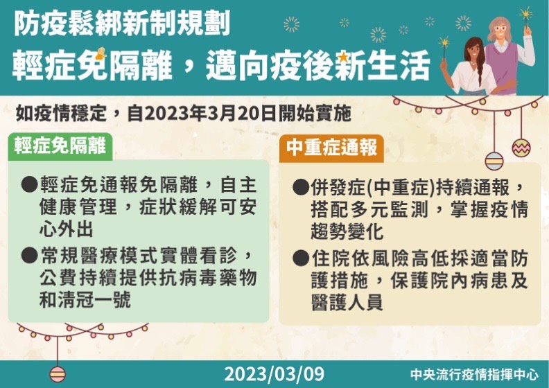 中央流行疫情指揮中心今天(3/9)表示,基於國內外疫情趨緩,宣布如疫情穩定,自3月20日(個案採檢日)起,調整「嚴重特殊傳染性肺炎」疾病通報定義,改為:符合COVID-19併發症(中重症)條件之民眾需通報並隔離治療,輕症或無症狀民眾如檢驗陽性,不需通報也不需隔離,但建議進行「0+n自主健康管理」,自主健康管理期間快篩陰性,或至距離發病日或採檢陽性日已達10天無需採檢,即可解除。相關配套措施將配合修訂及實施。